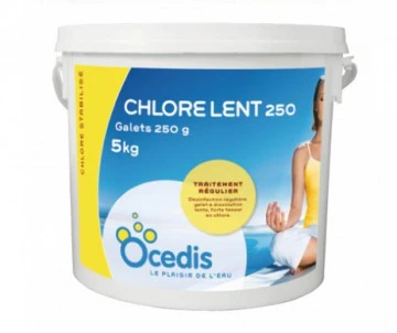 Chlore lent galet de 250gr.Désinfection régulière pour détruire tout type de micro-organisme (bactérie, champignon) dans la piscine.