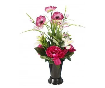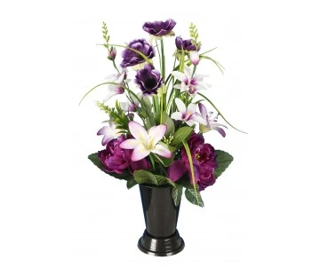 SPECIAL TOUSSAINT: Composition Artificielle. CONE BOUQUET GERBE LYS ANEMONE PIVOINE – H.49cm. Coloris au choix Mauve ou Bordeaux. Le cone lesté permet une tenue au vent et divers intempéries.