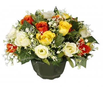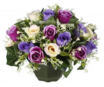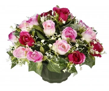 SPECIAL TOUSSAINT: Composition arrificielle. COUPE BOUQUET 24 BOUTONS DE ROSE– H.26cm. Coloris au choix Orange, Mauve ou Bordeaux. La coupe lestée permet une tenue au vent et divers intempéries.