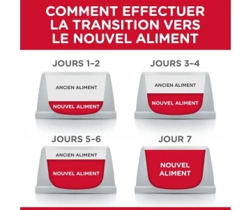 - Lors de la première utilisation de cet aliment, veillez à bien effectuer une transition alimentaire en mélangeant des quantités croissantes du nouvel aliment avec des quantités décroissantes de l’ancien sur une période de 7 jours.