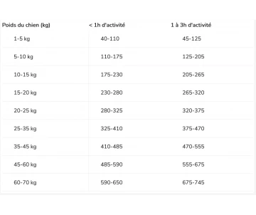 MODE D’EMPLOI : Voir le tableau des rations journalières recommandées (g/jour). Ces rations sont données à titre indicatif. Pour aider votre chien à maintenir une Condition corporelle idéale, les rations journalières doivent être adaptées à son niveau d’activité, sa Condition physique et ses besoins individuels. De l’eau fraîche et propre doit toujours être à la disposition de votre chien. Pour surveiller la santé de votre chien, consultez régulièrement votre vétérinaire.