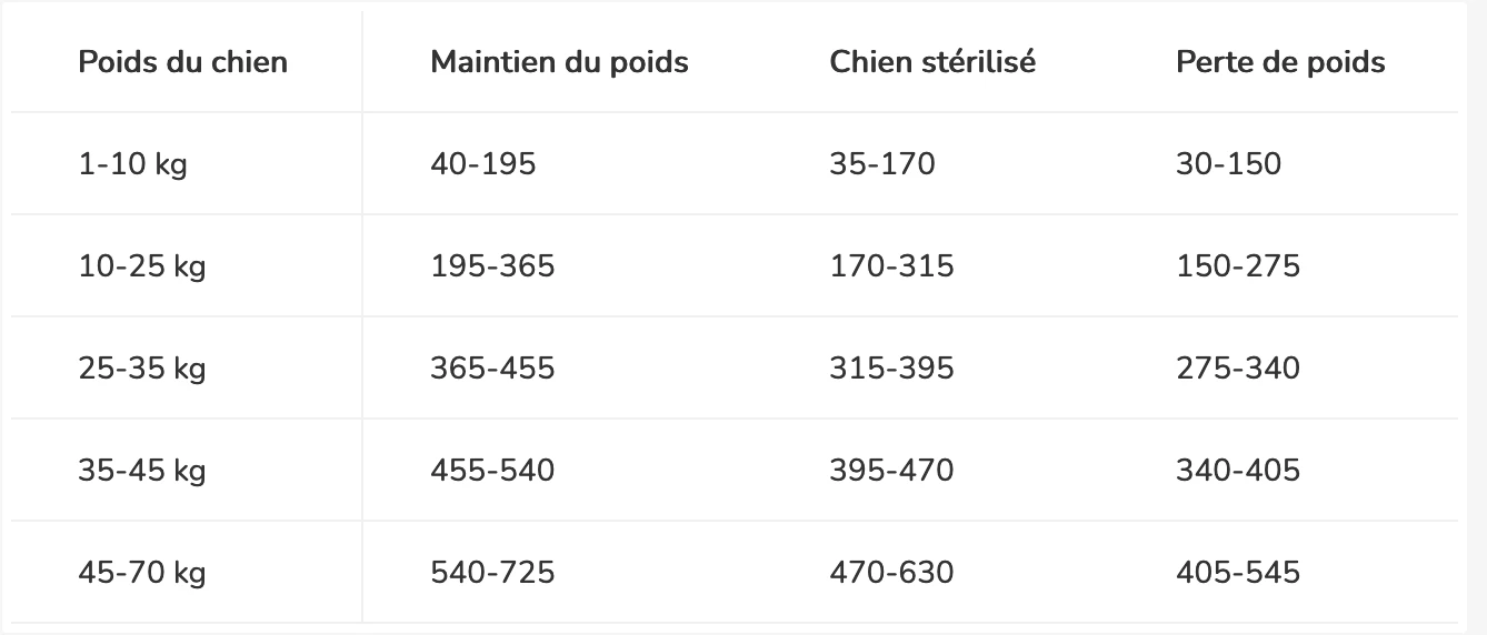 MODE D’EMPLOI : Voir le tableau des rations journalières recommandées (g/jour). Ces rations sont données à titre indicatif. Pour aider votre chien à maintenir une Condition corporelle idéale, les rations journalières doivent être adaptées à son niveau d’activité, sa Condition physique et ses besoins individuels. De l’eau fraîche et propre doit toujours être à la disposition de votre chien. Pour surveiller la santé de votre chien, consultez régulièrement votre vétérinaire.