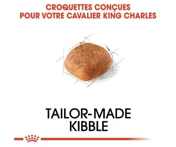 arce que chaque race est unique, il est important de s’assurer que l’alimentation de votre chien contient des nutriments spécifiques qui favoriseront une santé optimale. ROYAL CANIN® Cavalier King Charles Adult est spécialement formulé pour répondre à tous les besoins nutritionnels de votre chien Cavalier King Charles adulte et convient aux chiens de plus de 10 mois. ROYAL CANIN® Cavalier King Charles Adult contient des nutriments favorisant un bon fonctionnement cardiaque, notamment une teneur adaptée en minéraux, EPA et DHA, taurine, L-Carnitine et antioxydants. La formule de ROYAL CANIN® Cavalier King Charles Adult est précisément dosée en nutriments spécialement sélectionnés pour aider votre chien à se maintenir à son poids de forme. Sous son poil long, doux et soyeux se cache une peau sensible qui nécessite le plus grand soin. C’est pourquoi ROYAL CANIN® Cavalier King Charles Adult offre à votre chien des nutriments destinés à renforcer la santé de sa peau et de son pelage. ROYAL CANIN® Cavalier King Charles Adult contient des croquettes exclusivement conçues pour faciliter la prise de nourriture et la mastication des aliments par votre Cavalier King Charles.