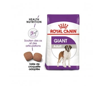 Croquettes Royal Canin Giant Adult pour chien de très grande race (plus de 45 kg) à partir du 18/24ème mois, formule Cardio-System pour soutenir la fonction cardiaque. Les chiens adultes de très grandes races (plus de 45 kg) ont besoin de croquettes ayant une taille et une forme spécifiques qui incitent à une mastication intensive et lente.
