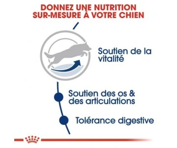 Tous les chiens vieillissent différemment, mais lorsque votre grand chien atteint sa cinquième année environ, les premiers signes de vieillissement peuvent commencer à apparaître. C’est pourquoi il faut garder à l’esprit qu’à chaque étape de la vie de votre chien, une alimentation équilibrée contribue de façon importante à le maintenir en bonne santé. La nourriture ROYAL CANIN® Maxi Adult 5+ est formulée en fonction des besoins nutritionnels de votre chien d’âge moyen et convient aux grands chiens âgés de 5 ans et plus dont le poids adulte se situe entre 26 et 44 kg. Les grands chiens d’âge moyen peuvent être sujets à la prise de poids, raison pour laquelle il est plus important que jamais de surveiller l’apport quotidien de votre chien et de prévenir la suralimentation. ROYAL CANIN® Maxi Adult 5+ contient un mélange unique et équilibré de protéines et de fibres alimentaires de très haute qualité, pour que chaque portion offre à votre chien ce dont il a besoin pour maintenir un bon poids de forme tout en favorisant une digestion optimale. ROYAL CANIN® Maxi Adult 5+ est spécialement conçu pour aider à renforcer la santé des chiens de grande taille à ce stade de leur vie, en renforçant leurs os, leurs ligaments et leurs articulations, ce qui signifie que votre chien peut aisément supporter son poids et garder un mode de vie actif. Même si votre chien commence à montrer les premiers signes de vieillissement, il restera encore plein d’énergie. C’est pourquoi ROYAL CANIN® Maxi Adult 5+ possède une teneur adaptée en nutriments, dont un complexe exclusif d’antioxydants pour contribuer à neutraliser les radicaux libres et aider votre chien à conserver sa vitalité et un métabolisme sain.