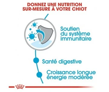Répond aux besoins énergétiques modérés du chiot de grande race qui connaît une croissance longue.