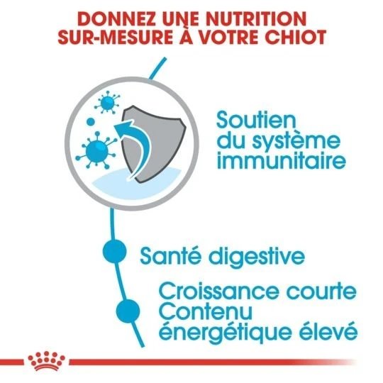L’assimilation de nutriments spécifiques améliore la santé du chiot à bien des égards pendant sa croissance. L’apport équilibré en calcium et en phosphore favorise un développement osseux harmonieux, tandis que la teneur élevée en énergie offrira à votre chiot toute la vitalité dont il a besoin pendant sa période de croissance courte et intense.