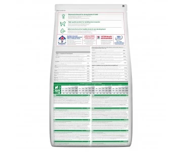 Hill’s™ Science Plan™ ALIMENT POUR CHIOT GRANDE RACE au POULET (poulet 18 % ; total volaille 28 %) est aliment complet pour les chiots qui atteindront 25 kg et plus à l’âge adulte, à donner jusqu’à l’âge de 18 mois.