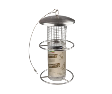 Cette mangeoire peut être facilement accrochée à un arbre et, grâce à sa conception astucieuse, offre de l’espace pour un nombre particulièrement important d’oiseaux.
