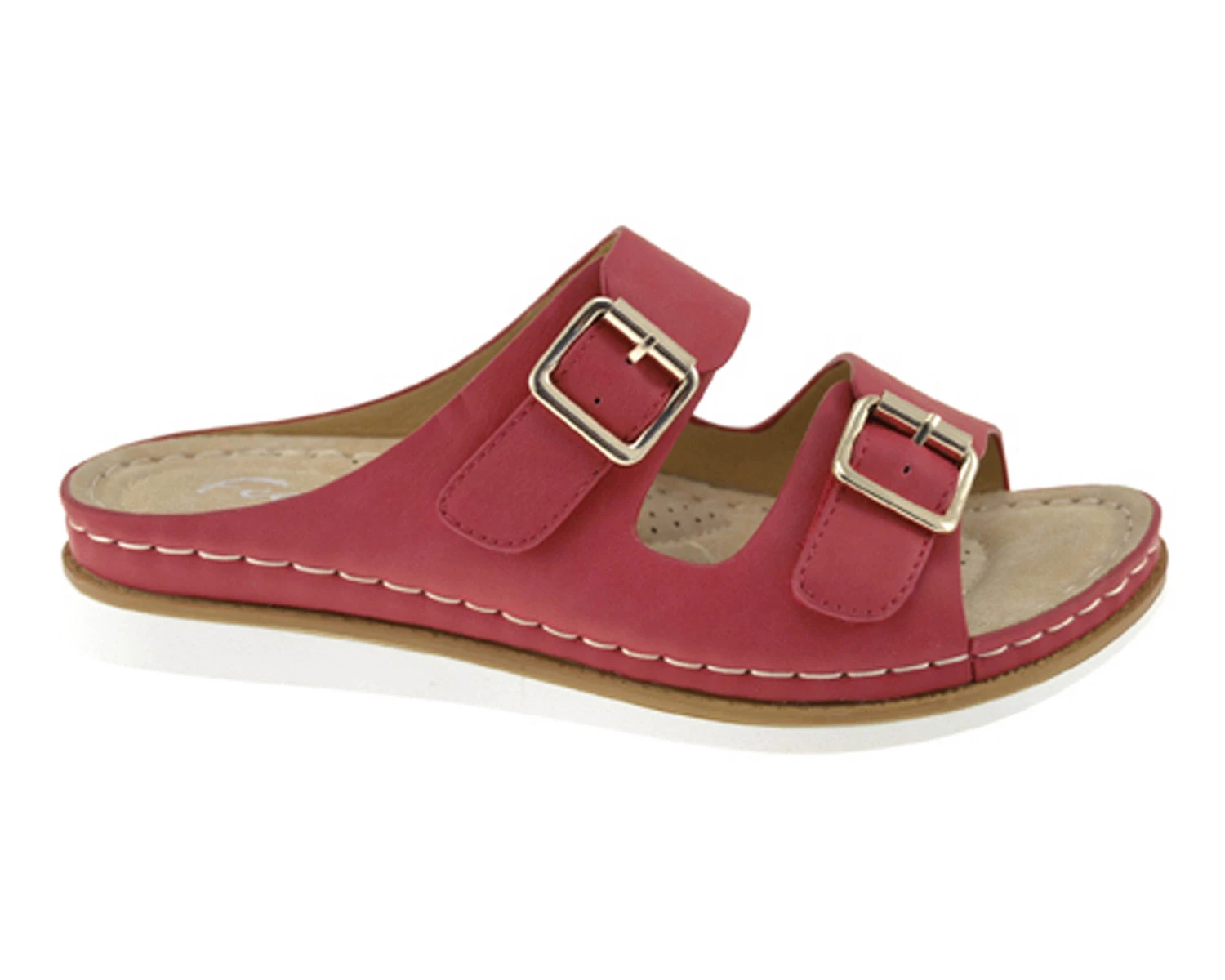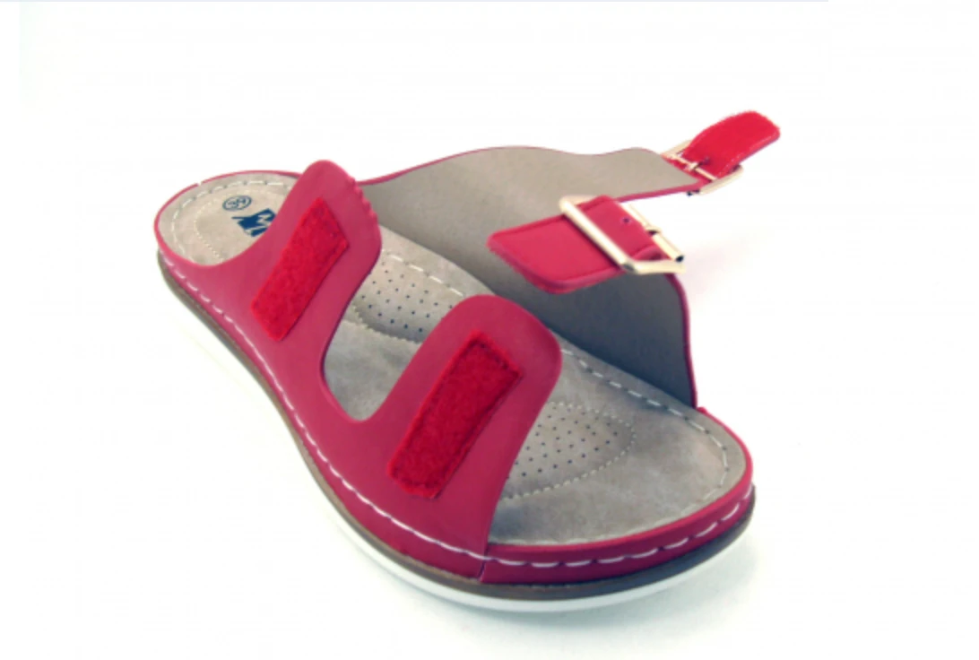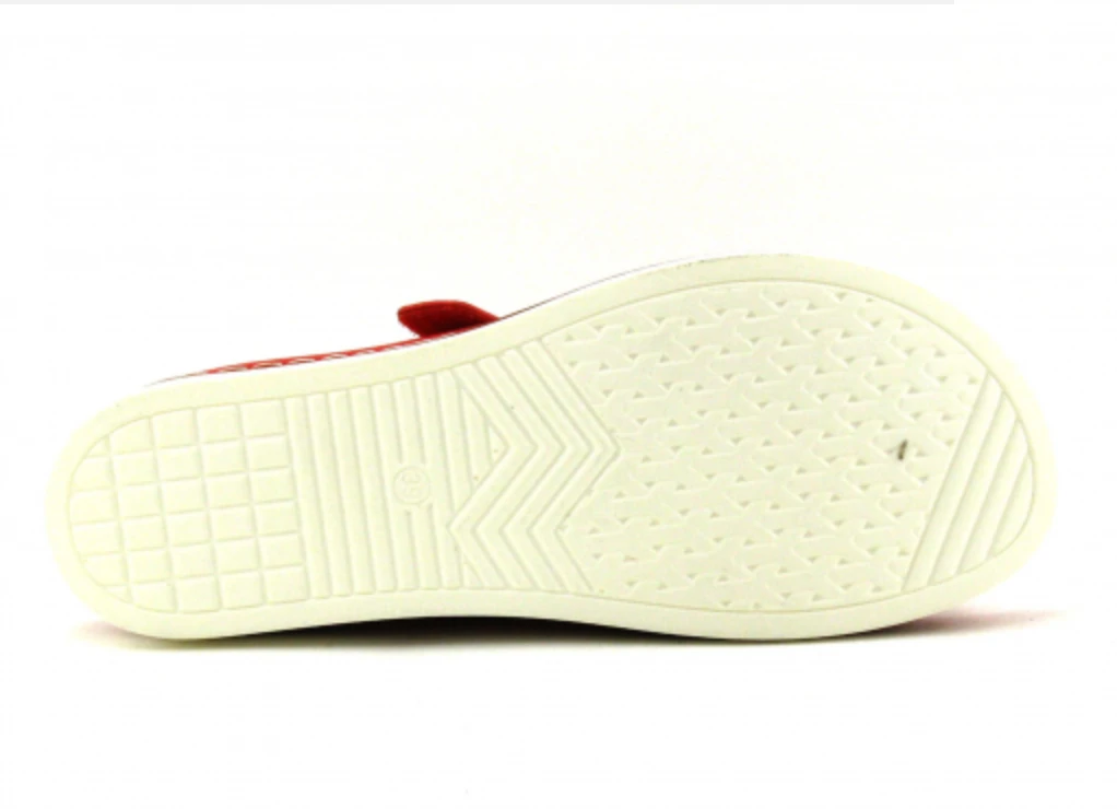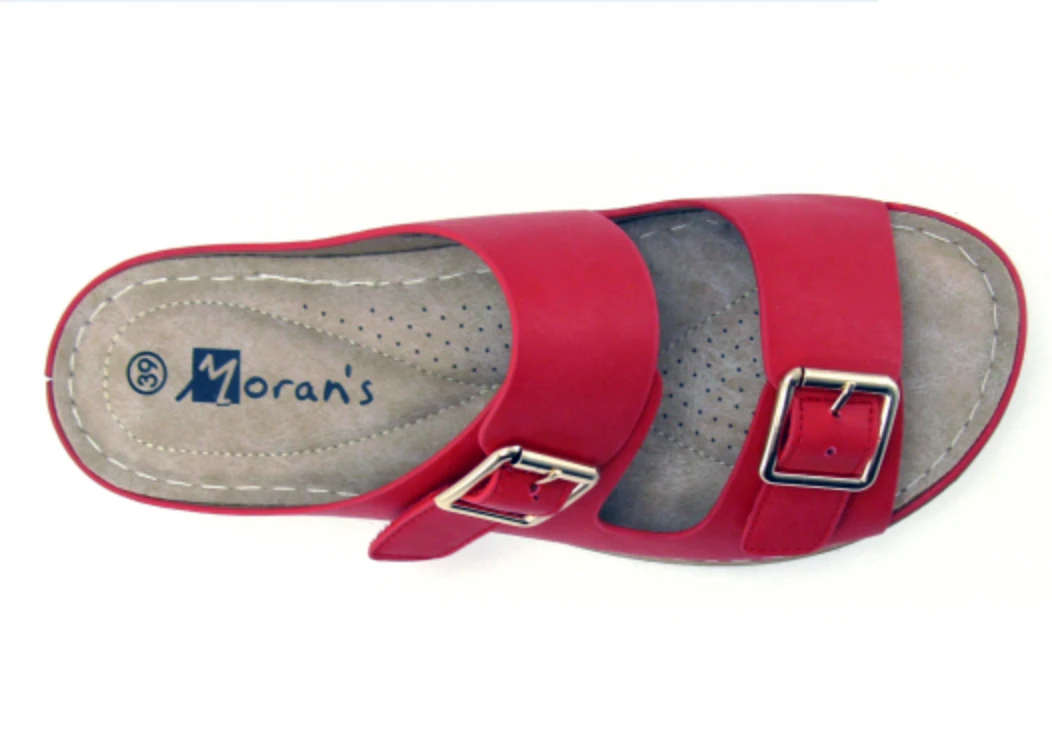 La semelle de marche des mules rouges Moran’s est légère à forme compensée, avec un talon d’environ 3.5 cm.