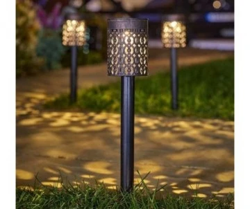 Lot de 8 piquets solaires effet bronze brossé. Chaque piquet mesure 30 cm de haut. Ceux-ci se chargent à la lumière du soleil, chacun ayant un panneau solaire sur le dessus et émettant ensuite une faible lumière blanche chaude la nuit tandis que la conception décorative découpée jette un motif charmant sur les environs