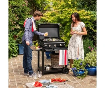 La plancha Amalia 3 brûleurs inox (6.9 kW) vous permettra d’accueillir entre 6 et 10 convives. Plaque fonte émaillée inclinable (avec trou). Sécurité thermocouple,Allumage piezzo électronique,Boutons de commande ergonomiques et antidérapants,Récupérateur inox carré 9*9 cm inclus. Chariot avec 2 roues, 2 poignées et 2 tablettes coulissantes peinture époxy.