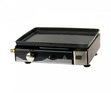 Plancha gaz Ustarizt, châssis 48x17x42.5cm, plaque de cuisson avec rebords incurvés en fonte émaillée de 42x35cm, 1 brûleur en U puissance 3.5KW. Allumage piezzo. Elle pourra régaler jusqu’à 8 convives. Garantie 2ans.