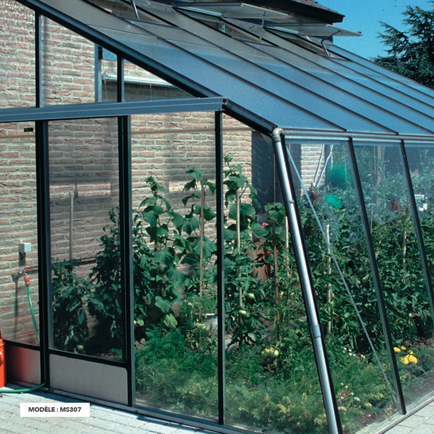 Les serres murales à parois droites peuvent être placées directement contre la maison. Vous pouvez prolonger votre habitation et votre jardin. Il est plus facile d’accéder à vos plantes dans la serre, surtout en soirée froide et pluvieuse.