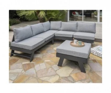 Ensemble d’angle New York; structure aluminium et coussinage tissu de 10cm d’épaisseur. Composé d’une table pouf ; 1 méridienne 3 places multi positions; 1 banquette 2 places. Cet ensemble aux lignes sobre et comtenporaines est entièrement modulable, il peut acceuillir jusqu’à 6 convives. Garantie 2ans.