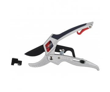 Sécateur avec fonction crémaillère 20 cm Exclusivité Spear & Jackson Il peut s’utiliser avec ou sans le système de crémaillère en fonction de vos besoins! Il est également fourni avec ses deux accessoires: un aiguiseur ainsi qu’un tampon huile. Corps robuste en aluminium et poignée avec insert antidérapant pour plus de confort. Caractéristiques – Longueur totale : 20 cm – Largeur totale : 7 cm – Hauteur totale : 1,5 cm – Poids : 0,215 Kg – Matière du manche : aluminium et soft touch – Diamètre de coupe : 25 mm Plus d’informations Lame en acier à haute teneur en carbone recouverte de téflon pour résister à la corrosion et faciliter l’entretien du sécateur.