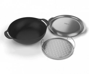 Le wok de Weber en fonte avec sont couvercle et sont panier à vapeurs combine les atouts de deux techniques de cuisson. Un wok léger permet de préparer des plats poêlés, l’insert à étuver permet d’étuver les légumes et le poisson. Grâce au système GBS, le wok peut être utilisé dans de nombreux modèles de barbecue de Weber, ce qui garantit une grande flexibilité.